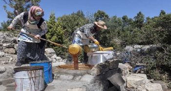 Pekmez üreten kadınlar sandıklara topladıkları ürünleri ‘pekmezlik' adını verdikleri üretim alanlarına getirdi. Üzümleri çiğnedikten sonra harlı ateşin üstünde kaynatan kadınlar, daha sonra bu üzümleri haşlayıp süzdü. 4-5 saatlik bir kaynama sürecinin ardından süzülen üzümler pekmez halini aldı. Kadınlar bütün bu zahmetli üretim sürecinin ardından pekmezleri bir kez daha süzdü, şişeledi ve satışa hazır hale getirdi.