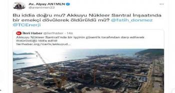 Bazı sosyal medya hesaplarında ve haber sitelerinde, Akkuyu Nükleer Güç Santrali'nde çalışan bir işçinin iddiasına dayanılarak, 'maaşlarını alamadıkları için eylem yapan işçilerden birinin güvenlik görevlisi tarafından darp edildiği ve hayatını kaybettiği' yönünde haberlere yer verildi. CHP Mersin Milletvekili Alpay Antmen de bir haber sitesinin paylaşımını, 'Bu iddia doğru mu? Akkuyu Nükleer Santral inşaatında bir emekçi dövülerek öldürüldü mü?' sorusuyla sosyal medya hesabından paylaştı. AK Parti Mersin Milletvekili Hacı Özkan da kendi sosyal medya hesabından yaptığı paylaşımda, iddiaların ve haberlerin asılsız olduğunu belirterek, Antmen'in paylaşımına tepki gösterdi. Özkan, paylaşımında şu ifadelere yer verdi; "Akkuyu Nükleer A.Ş. yetkilileri ile görüştüm. Bu iddia tamamen asılsızdır ve 'iddia edildi' tarzı habercilik ile ülkemizin yüz akı projelerini karalamak bir milletvekiline yakışmamaktadır."