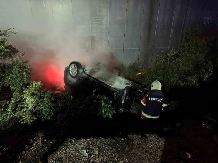 Mersin’de seraya çarpıp ters dönen elektrikli araçtaki batarya yangını itfaiye ekiplerince söndürülürken, sürücü hastaneye kaldırıldı.